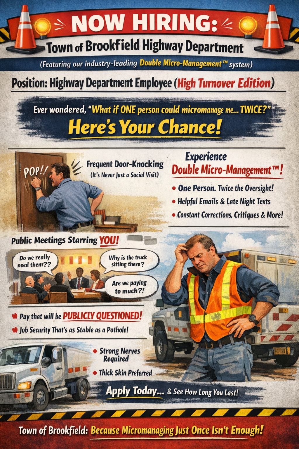 NOW HIRING: Town of Brookfield Highway Department (This article is satire and reflects commentary on public governance and leadership practices. It is not a factual job posting.) (Featuring our industry-leading Double Micro-Management™ system) Position: Highway Department Employee (High Turnover Edition) Job Summary:Do you enjoy working outside while being managed from